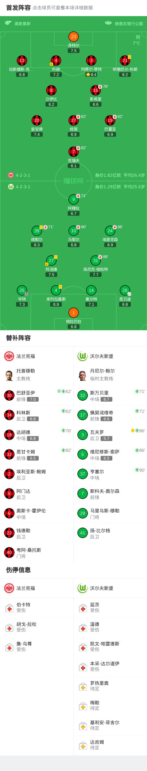 法蘭克福1-1沃爾夫斯堡,岑特打破僵局,巴舒亞伊扳平比分